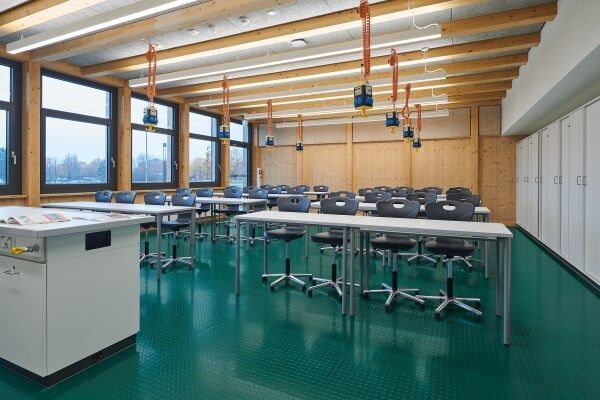 „Der norament 926 Noppenboden passte mit seiner hochwertigen Qualität, dem charaktervollen Design und der angenehmen Haptik ideal ins Farb- und Materialkonzept“, so Projektleiter Marc Nuding von Bez+Kock Architekten. Vor allem überzeugte die Möglichkeit, den Kautschukbelag bereichsübergreifend in allen Unterrichtsräumen einzusetzen – auch in den Fachräumen und der Lehrküche. „In den naturwissenschaftlichen Klassenräumen musste der Boden beständig gegen die im Unterricht eingesetzten Chemikalien sein und in der Lehrküche war eine hohe Rutschfestigkeit gefragt – alle diese funktionalen Anforderungen erfüllen die norament 926 Beläge bestens.“