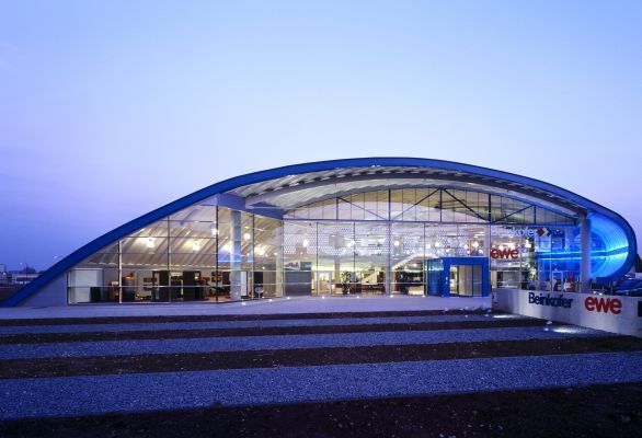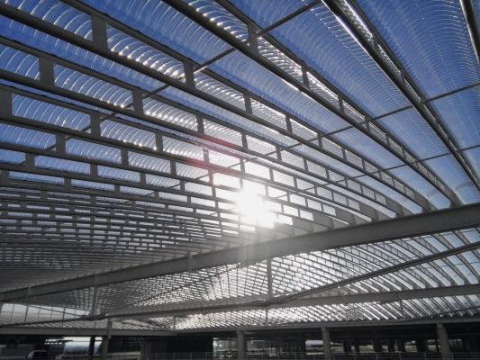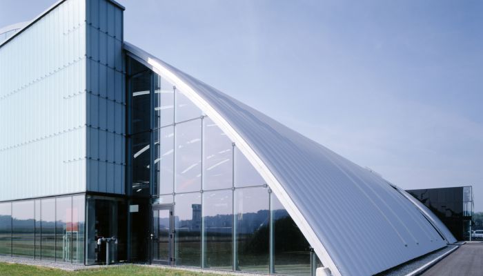 Die hochwertigen Dachschalen mit einer Baubreite von 610 mm sind sowohl in Spannrichtung als auch in Dachschalenbreite gebogen und können frei von Auflager zu Auflager gespannt werden. Die doppeltgekrümmten Dachschalen werden nebeneinander angeordnet und sind in Dachlängsrichtung beliebig erweiterbar.