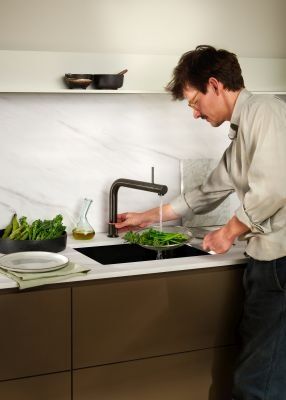 Der Quooker Flex verfügt über einen flexiblen ausziehbaren Schlauch für zusätzliche Reichweite im Spülbecken, wodurch besonderer Komfort beim Spülen, Reinigen und Befüllen geboten wird.