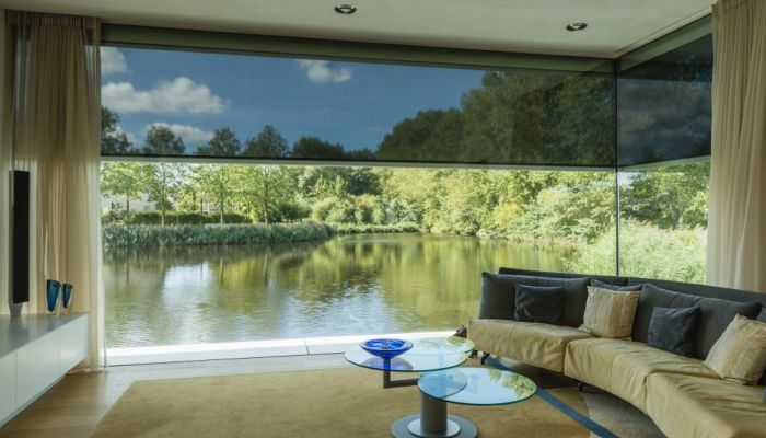 Große Panoramafenster und Fensterfronten sind eine Wohltat für die Seele. Sie füllen den Wohnraum mit natürlichem Licht und können den Bewohnern eine erholsame Aussicht bescheren. Allerdings kann dieser Segen schnell zum Übel werden, wenn die heißen Sommermonate Einzug erhalten. Genau dies musste ein Ehepaar im niederländischen Goes erfahren. Sie ließen sich im Jahr 2014 von Architekt Levien De Putter von Alliantie, Goes, einen Atriumbungalow mit rahmenlosen Über-Eck-Fenster entwerfen. So ließ sich zwar die idyllische Aussicht des direkt am Wasser gelegenen Wohnraumes genießen, doch da es zur Bauzeit noch keine passende Sonnenschutzlösung für die Wohnsituation gab, wurden die großen Glasflächen im Sommer schnell zum Problem: „An heißen Tagen war es vor Hitze innen einfach nicht mehr auszuhalten. Wir haben es auch mit einem Sonnenschutz an der Innenseite des Fensters versucht, aber das hat überhaupt nichts gebracht, denn die Hitze war bereits im Haus und damit der Schaden schon angerichtet“, so Bauherr Tom Schraven.