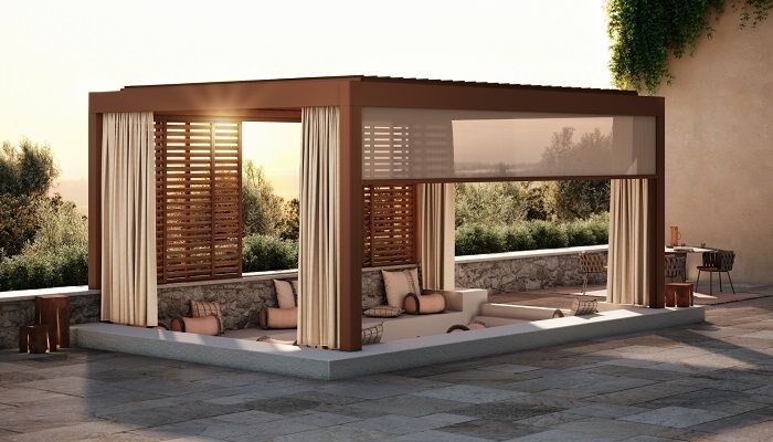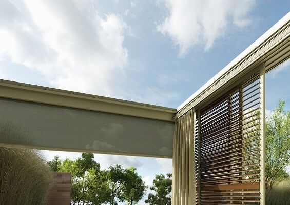 Warme, südliche Farben, Texturen und Materialien bilden die Inspiration für Earth Oasis. Erdtöne wecken sofort Sommergefühle. Natürliche und traditionelle Materialien schaffen eine perfekte Harmonie zwischen innen und außen. Eine erdig-braune Terrassenüberdachung mit Fixscreens und Loggiawood-Schiebeläden.