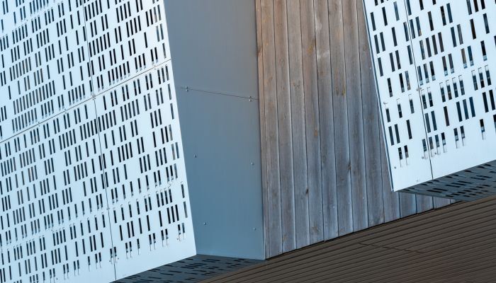 Für die charakteristische Optik lieferte RMIG Solutions rund 1.300 Aluminiumtafeln mit einer speziellen rechteckigen Lochung. Das Besondere an diesem Design ist das Spiel mit der Lichtdurchlässigkeit: Die Paneele wurden mit variierenden offenen Flächen gefertigt, um mit der Anordnung der Tafeln ein dynamisches Fassadenbild zu erschaffen.