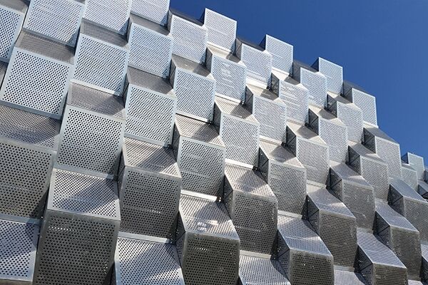 Fassadenverkleidungen aus Lochblech oder Streckmetall eignen sich aufgrund ihrer designorientierten Transparenz und großen Flächenstabilität auch hervorragend als Sonnen- und Sichtschutzelemente. Die Möglichkeit flexibel auf tages- und jahreszeitlich bedingte Wetterschwankungen zu reagieren, um bei minimalem Energieaufwand ein behagliches Raumklima zu schaffen, sollte in die Planung einbezogen werden. Unterschiedliche Nutzerbedürfnisse und die Ausrichtung der Fassade (stärkere Beschattung an der Süd- und Westseite) werden durch vielfältige Ausführungsvarianten berücksichtigt.