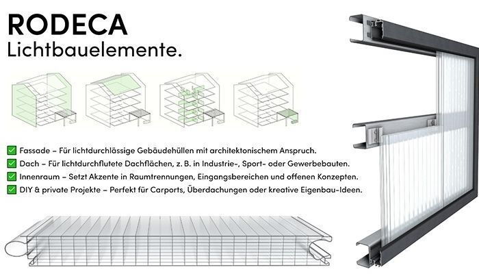 Die Polycarbonat-Lichtbauelemente der Rodeca GmbH eröffnen Architekt:innen vielfältige Gestaltungsspielräume. Unterschiedliche Strukturen, Farben und Oberflächenvarianten ermöglichen eine gezielte Lichtführung – von diffus bis akzentuiert. Fassaden lassen sich funktional optimieren und gleichzeitig architektonisch prägnant inszenieren.