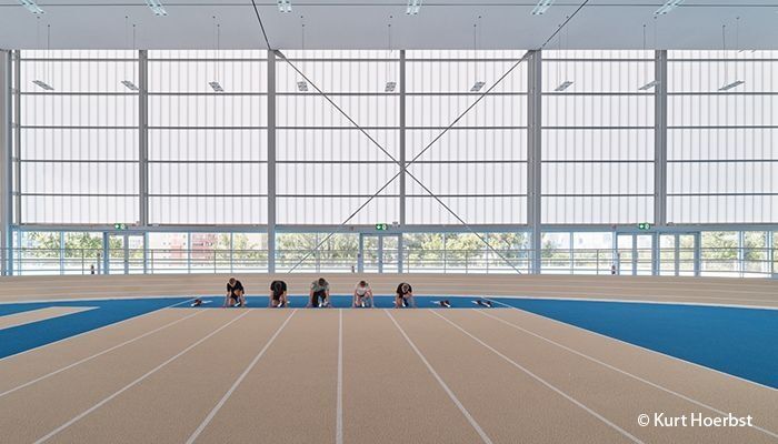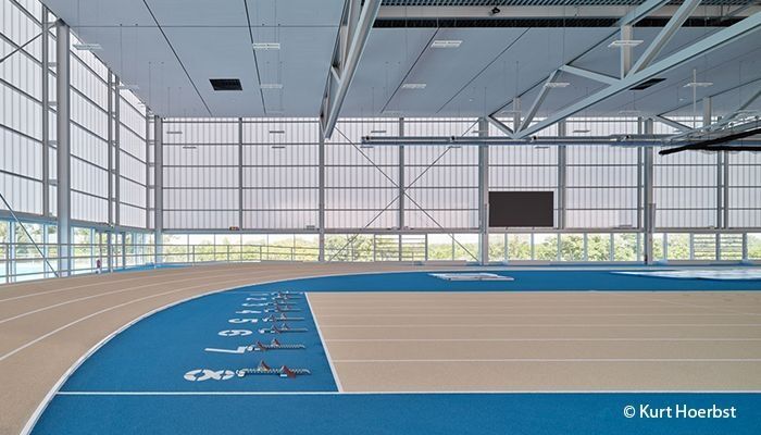 Zum Einsatz kommt das 60 mm starke Paneel PC 2560-12 in der DuoColor-Version Heatbloc L / opal. Die großflächige, lichtdurchlässige Außenhaut verleiht dem Gebäude eine moderne, transparente Anmutung und sorgt zugleich für eine gleichmäßige, blendfreie Tageslichtversorgung im Innenraum. So entsteht eine helle, offene Atmosphäre, die den sportlichen Charakter des Gebäudes unterstreicht.