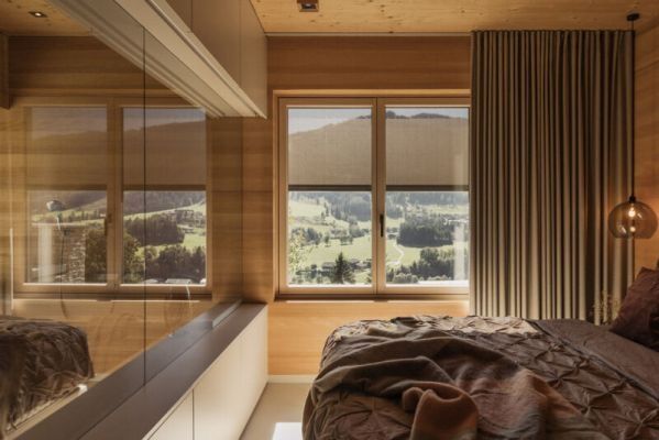 Die Architektur des „Hochsitz“ setzt auf natürliche Substanz und zeitlose Ruhe: Luserner Naturstein, regionale Weißtanne und großformatige Holzdielen prägen das Erscheinungsbild. Großzügige Fensterflächen öffnen den Blick in die Umgebung – und genau hier entfalten ROMA Textilscreens ihre Wirkung.