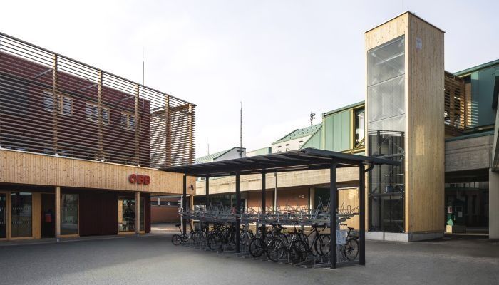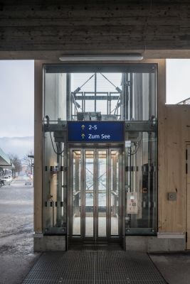Der neue ÖBB-Aufzug am Vorplatz der Bahnüberführung setzt ein architektonisches Highlight und ermöglicht zugleich eine komfortable, barrierefreie Anbindung zum Bahnsteig. Der Aufzugsschacht wurde in Massivholzbauweise errichtet und durch Glasflächen an Vorder- und Rückseite besonders transparent gestaltet. So fügt sich die Anlage offen und modern in das Umfeld ein.