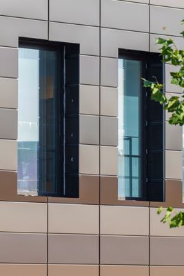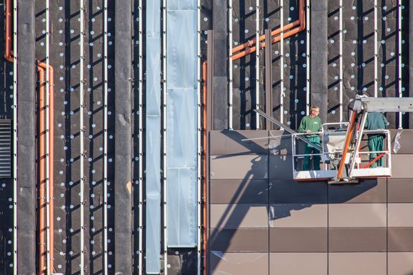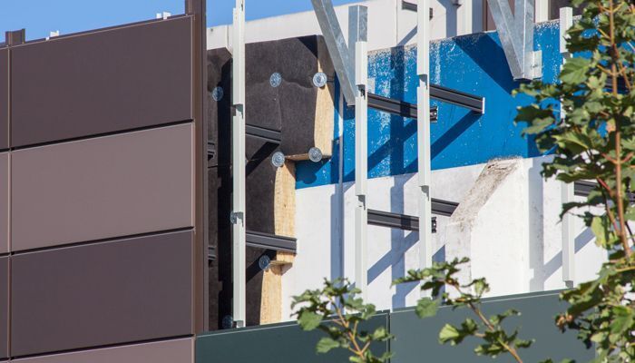 Für die Befestigung der hinterlüfteten Fassade wurde Slavonia mit seinem SPIDI® Fassadensystem beauftragt. Durch die vielseitige Einsetzbarkeit bot es die wirtschaftlichste Lösung, da zusätzlich zu den zu überbrückenden Betonrippen mit 500 mm, hohe Belastungen durch Windkräfte und das Gewicht der Bekleidung mit Stahlsidings zu beachten waren. Slavonia unterstützte auch bei der Planung für ein einheitliches Erscheinungsbild unter Einbeziehung der thermisch bedingten Längenänderung, um vor allem den Versatz der Fugen zu vermeiden, sowie bei der Ermittlung der Auszugswerte zur Feststellung der Tragfähigkeit des Untergrundes und der daraus resultierenden Dimensionierung des Systems.