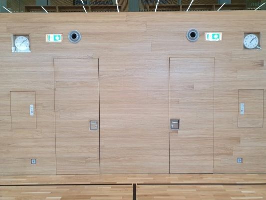 Eine riemenartige Verlegung einzelner Dielen ermöglicht sowohl dieses einheitliche Erscheinungsbild als auch ein ruhiges Farbschema – ganz ohne Unterbrechung der Oberfläche. Dabei spielt es keine Rolle, ob notwendige Einbauteile wie Türen, Kästen, Tore oder Mobilwände in die Prallwand integriert sind.