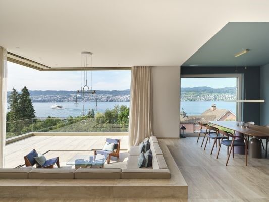 Mit swissFineLine lassen sich die beweglichen Fensterelemente auch über Eck anordnen und aufschieben, um die Raumgrenzen förmlich verschwinden zu lassen. Dabei gleiten die großen Fensterflügel nahezu lautlos auf den im Fußboden verborgenen Führungsschienen. Das rahmenlose Design der Verglasungen verstärkt diesen Effekt zusätzlich.