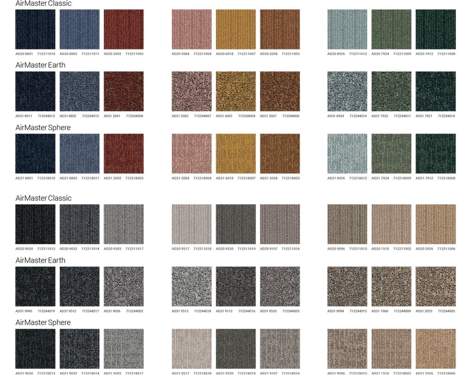 Die neuen DESSO AirMaster Kollektionen bieten jeweils eine Vielzahl kräftiger Farben und wunderschöner Neutraltöne. Von den subtilen Linien der AirMaster Classic über die dramatische Tiefe der AirMaster Earth bis hin zur tonalen Textur der AirMaster Sphere - jede Kollektion hat ihr eigenes einzigartiges Design. Durch die gemeinsame Farbpalette lassen sich die drei Kollektionen jedoch perfekt miteinander kombinieren und ermöglichen eindrucksvolle Bodengestaltungen, sei es als Raummittelpunkt, zur Arbeitsplatzgestaltung oder als Wegführung.