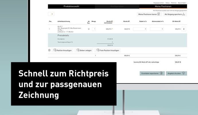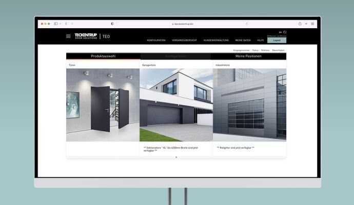 Schnell und einfach nicht nur die perfekte Tür und das optimale Tor, sondern auch direkt den passenden Preis finden? Der TEO-Produktkonfigurator macht es möglich. Mit TEO – Teckentrup Einfach Online – wählen Sie die erforderlichen Maße und Varianten des Produktes aus und erhalten unmittelbar den genauen Richtpreis. Darüber hinaus lassen sich komfortabel alle dazugehörigen Zeichnungen abrufen. TEO ist Plattform und Konfigurator in einem – die beste Lösung, um Ihre Bauvorhaben individuell und effizient zu gestalten, zu verwalten und alles in einem Blick zu haben. Online und von überall!