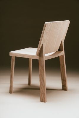 Von hinten betrachtet entfaltet KÖSS eine beinahe humorvolle, charmante Wirkung: Die Rückenlehne erinnert an ein kleines Schulkind mit einer viel zu großen Schultasche – ein Bild von Neugier & Unbeschwertheit. Ganz aus Massivholz gefertigt, vereint der Stuhl handwerkliche Präzision mit einer warmen, haptischen Präsenz. Die Details sind konstruktiv durchdacht und sprechen von Stabilität und Leichtigkeit zugleich.