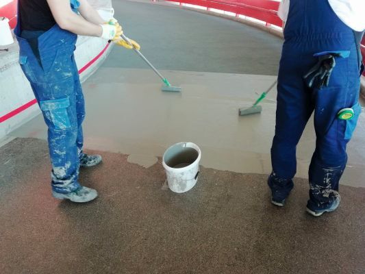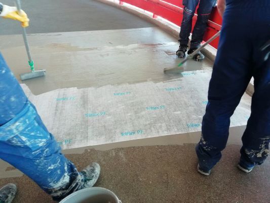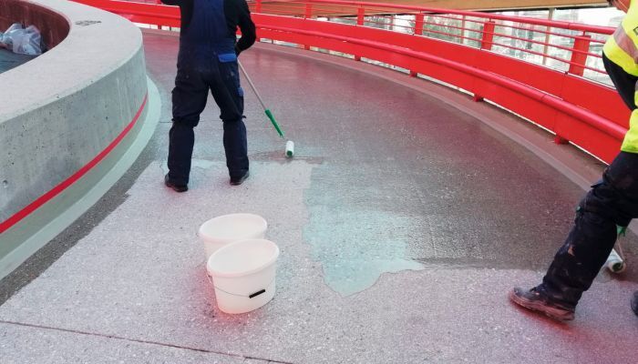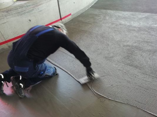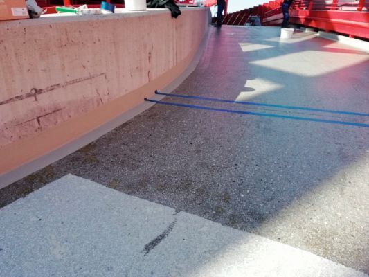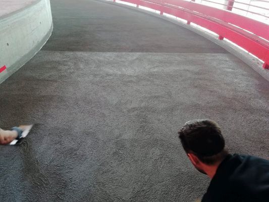Durch das integrierte, elastische Spezialvlies können Bauwerksbewegungen schadlos aufgenommen werden. Zudem ist der schub- und scherfeste Aufbau widerstandsfähig gegenüber mechanischen und chemischen Einflüssen. Bonus: das Material härtet zügig durch, wodurch lange Sperrzeiten wegfallen und kann auch bei niedrigen Temperaturen verarbeitet werden. Vor dem Auftragen der Oberfläche wurden natürlich Schäden mit dem Reparaturmörtel Triflex Cryl RS 240 ausgebessert. Jetzt gewährt die rutschsichere Beschichtung Triflex Cryl M 264 Verkehrsteilnehmern nicht nur größtmögliche Sicherheit, sondern bietet stark beanspruchten Flächen mit einem SRT-Wert von 59 nach acht Millionen Radüberrollungen ein Extra an Qualität.