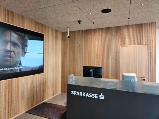 Es freut uns besonders, dass die hochwertigen Wandverkleidungen in der gesamten Bankfiliale durchgängig gestalterisch eingesetzt sind und angrenzende Bauteile bis ins kleinste Detail perfekt integriert wurden.