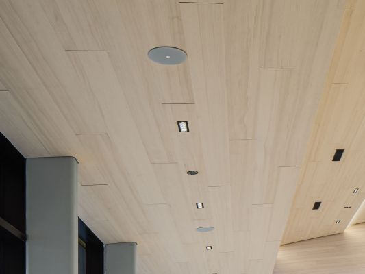Akustikdecke VARIOSORBER+LOCHFORM R16D8 in MDF+Eichefurnier.