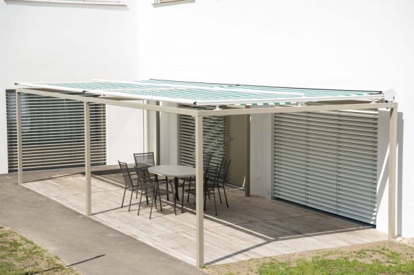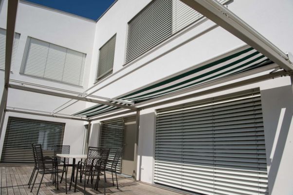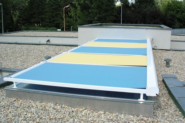 ROMA ist speziell für schräge Flächen designt. Die Außenbeschattungsanlage wird mittels Abstandshalter auf die Unterkonstuktion montiert, dadurch ist eine einfache und flexible Montage möglich. Für größere Anlagen ist die Kopplung mehrerer Felder möglich, jedoch maximal 2 Felder über einen einzelnen Elektroantrieb.