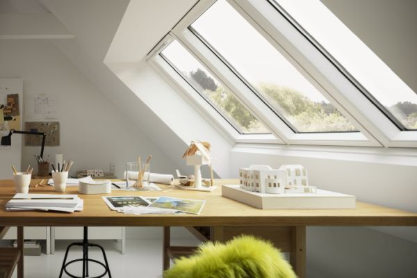 Räume unter dem Schrägdach werden dank großflächiger Lichtlösungen zu hellen, attraktiven Wohn- und Aufenthaltsbereichen. Nebst den bekannten Varianten wie Cabrio, VELUX Kombinationslösungen oder die Systemlösung RAUM+LICHT bietet das „3 in 1“ eine zusätzliche Lösung, die mit viel Luft, Licht und Ausblick zum Wohlbefinden der Bewohner beiträgt. Möglich wird dies durch ist die Kombination von einem feststehenden mittleren Fensterelement mit zwei öffenbaren Fensterflügeln in einem einzigen großen Rahmenelement. Die hierbei verwendeten, besonders schlanken Profile erlauben einen fast uneingeschränkten Ausblick.