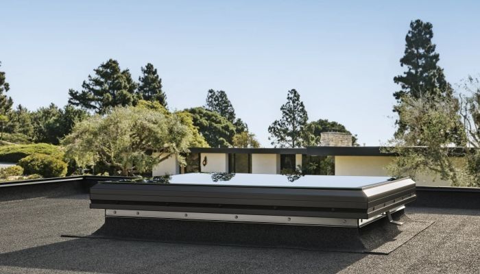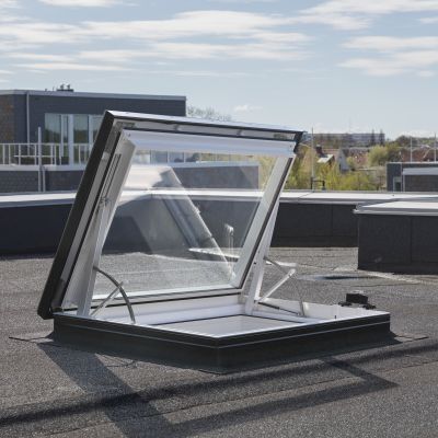 Zusätzlich bietet VELUX auch eine Reihe an Flachdachlösungen mit Sonderfunktionen an. Für die neue Generation der VELUX Flachdach-Fenster ist auch eine Variante für Ausstieg aufs Dach erhältlich. Damit lässt sich bei Bauvorhaben mit speziellen Anforderungen eine einheitliche Gestaltung der Oberlichter mit den anspruchsvoll designten Konvex- oder Flachglas-Lösungen realisieren.