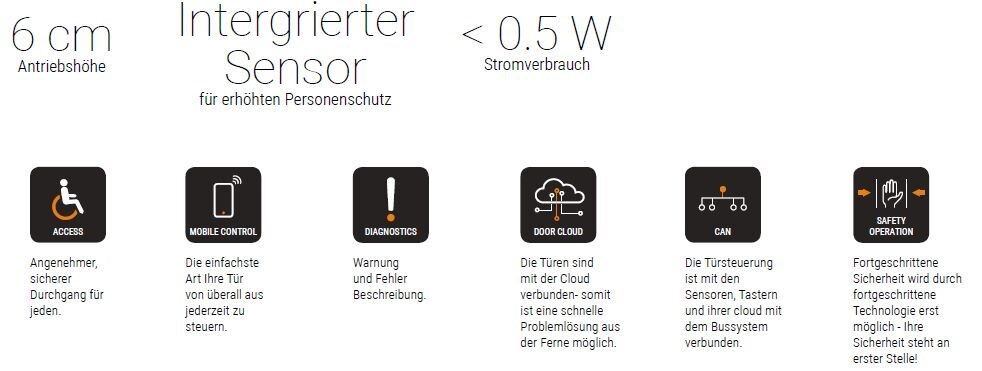 Eine Antriebshöhe von nur 6 cm und eine Bandbreite an erstklassigen Materialien zeichnen diese Produktreihe aus. Der Stromverbrauch des Sensors liegt im Schlafmodus unter 0,5 W. Diese Türe ist auch für Flucht- und Rettungswege gemäß EN16005 geeignet. Sie passt zu jedem Interieur und schafft einen einzigartigen und modernen Raum.