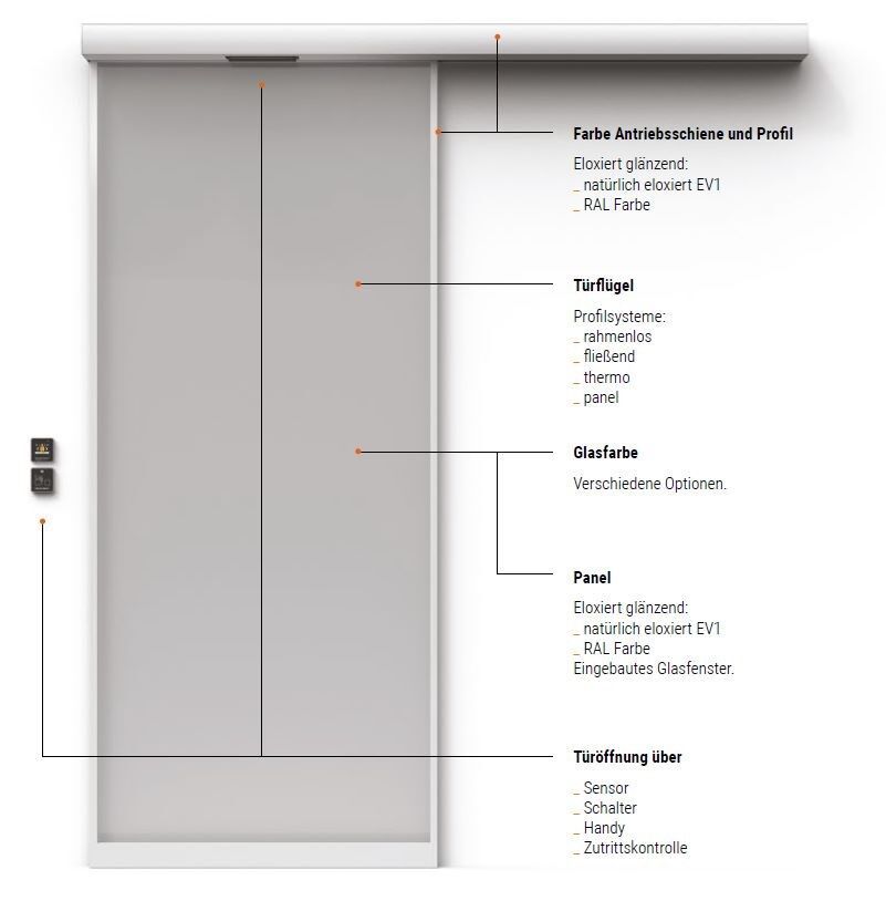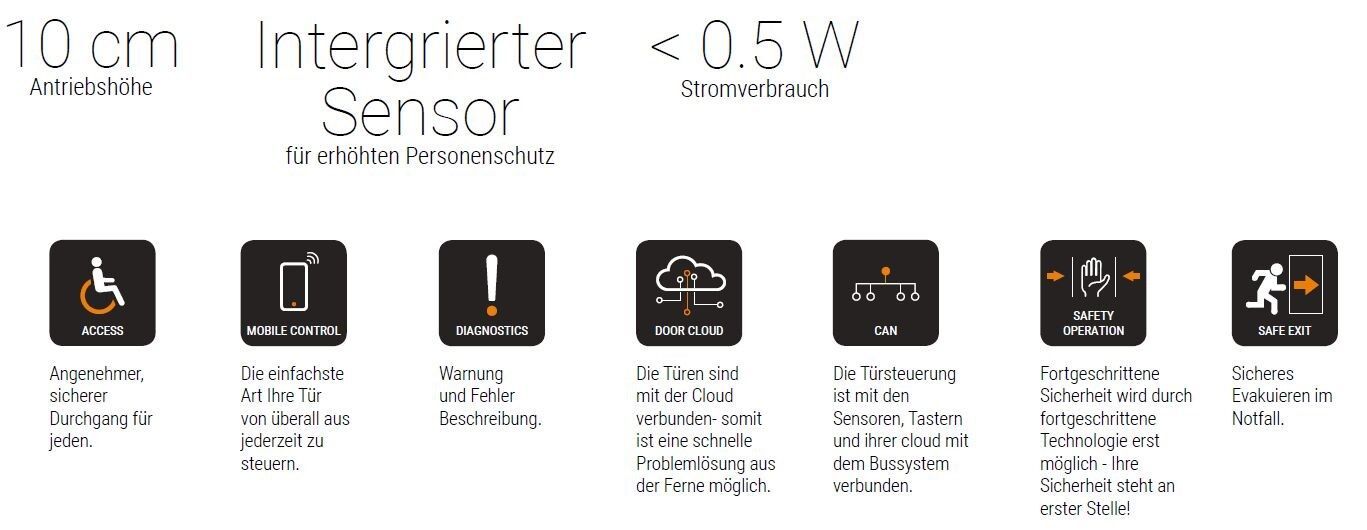Durch die unaufdringliche, schmale 10 cm Antriebshöhe erhält Raum einen modernen Look. Für die einfache Steuerung gibt es einen innovativen Display-Programmwahlschalter. Der Sensor verbraucht im Schlafmodus weniger als 0,5 W Strom. Diese Türe ist auch für Flucht- und Rettungswege gemäß EN16005 geeignet.