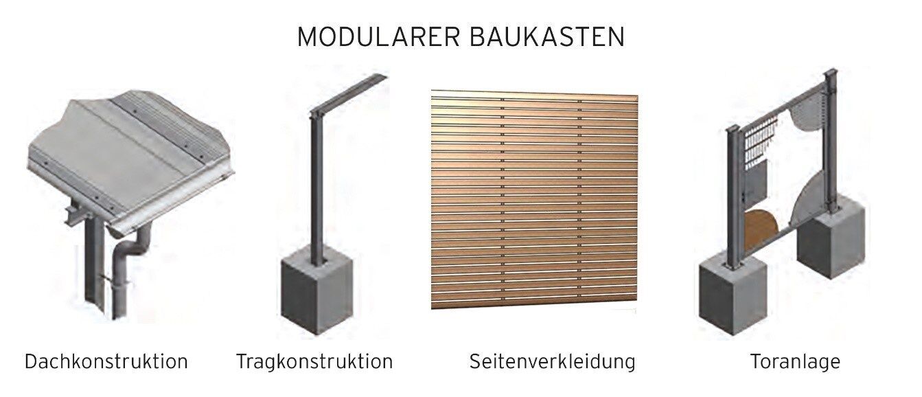 Durch den modularen Baukasten von projekt w, der sich aus verschiedenen feuerverzinkten Stützen-Trägersystemen und vielfältiger Dachtypen sowie einem großen Sortiment aus Seitenverkleidungen zusammensetzt, sind dem Gestaltungs- und Planungsspielraum keine Grenzen gesetzt.