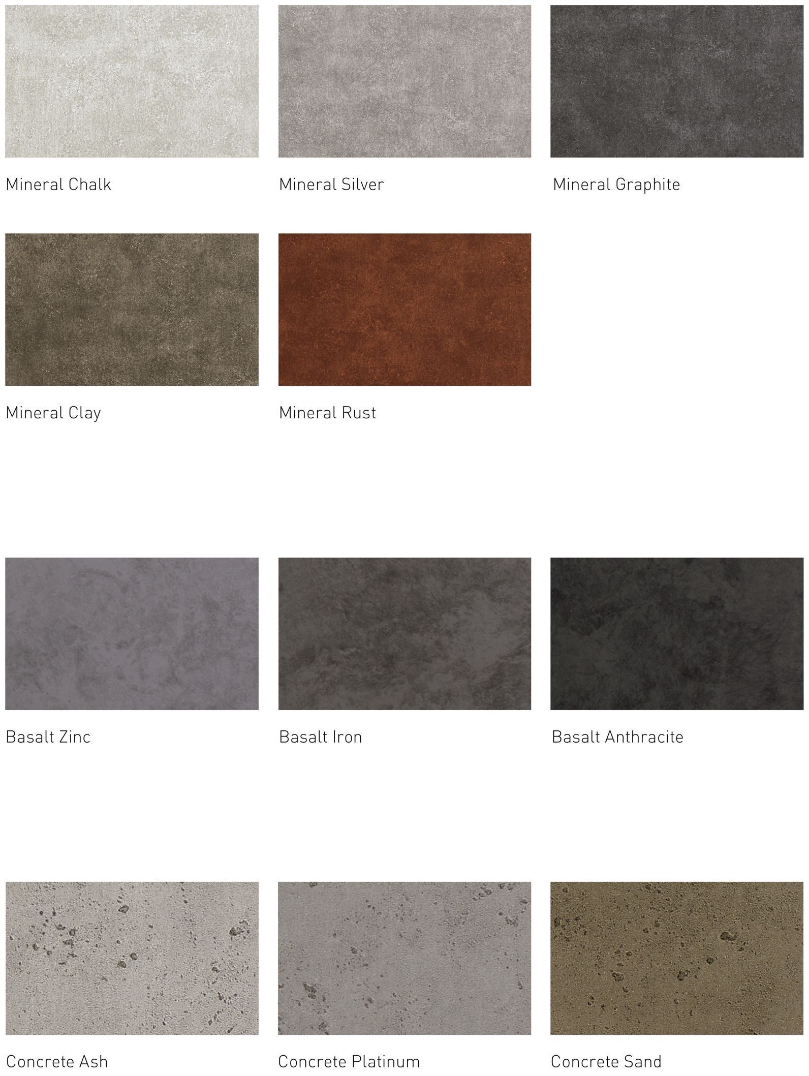 Mit drei verblüffend authentischen Looks "Mineral", "Basalt" und "Concrete" in insgesamt elf Designvarianten steht Architekten und Planern eine breite Palette zur Gestaltung visionärer Fassaden in Steinoptik zur Verfügung.